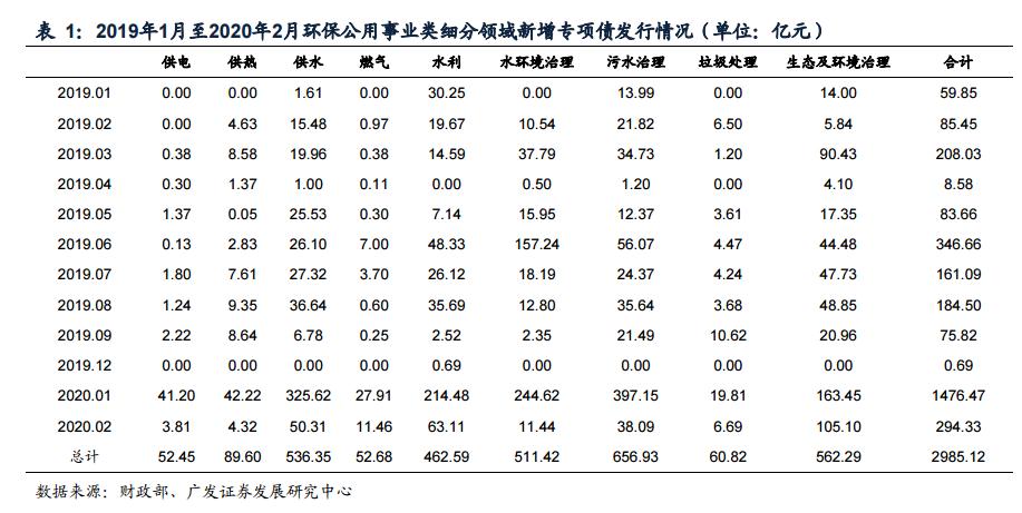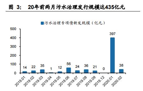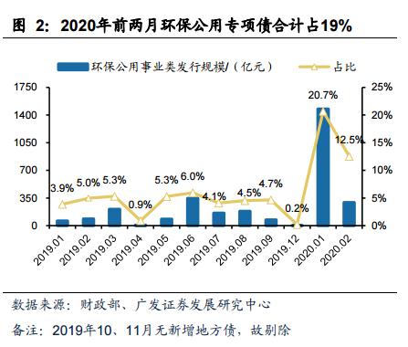 环保专项债开年以来发行超预期,占比同比提高 14 个百分点。根据财政部披露的专项债数据显示:2020 年前两月专项债合计发行规模 9498 亿元,同比增长近 2 倍。专项债投资于基建领域占比同比大幅提升(引用自广发宏观 2020 年 2 月 24 日报告《已发行专项债投向了哪些领域?》),环保公用事业作为基建组成部分,1-2 月新增专项债规模达 1771 亿元,占总发行规模的 19%,较 2019 年 3.9%-5%的占比大幅提升。