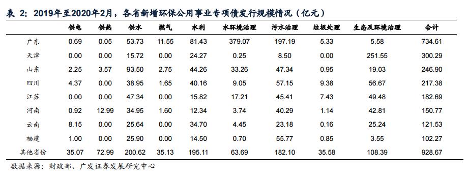 从地域角度来看,2019年1月至2020年2月,广东、天津、山东、四川四省新增专项债占全国比例达50%,四省中除天津外,广东、山东、四川投资于水务项目比例分别为95%/88%/67%。