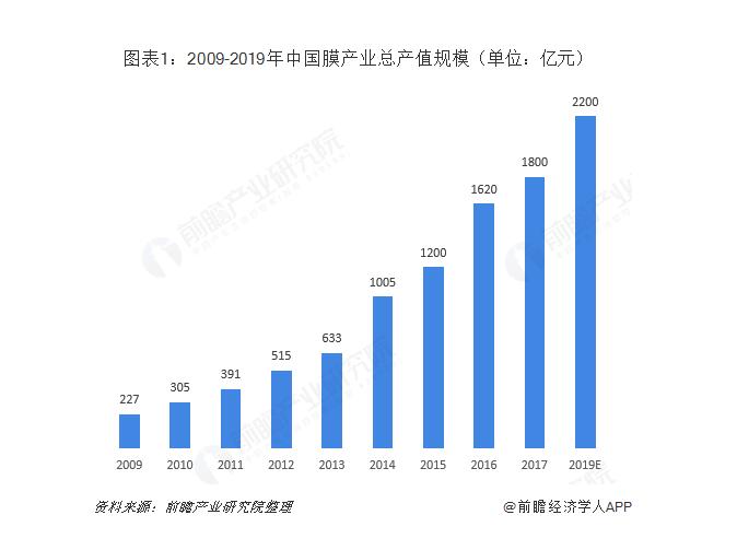 同时,膜产业总产值(膜产品、膜组件、膜辅助设备及相关项目总产值)大幅增长,从2009年的227亿元增长到2017年的1800亿元。2019年,膜产业总产值预计达到2200亿元。