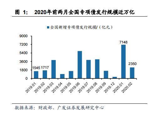 环保专项债开年以来发行超预期,占比同比提高 14 个百分点。根据财政部披露的专项债数据显示:2020 年前两月专项债合计发行规模 9498 亿元,同比增长近 2 倍。专项债投资于基建领域占比同比大幅提升(引用自广发宏观 2020 年 2 月 24 日报告《已发行专项债投向了哪些领域?》),环保公用事业作为基建组成部分,1-2 月新增专项债规模达 1771 亿元,占总发行规模的 19%,较 2019 年 3.9%-5%的占比大幅提升。