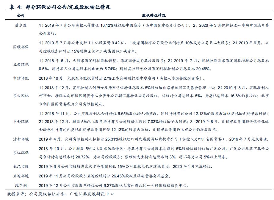 关注国企\央企入驻的“后效应”。碧水源公告股东拟将 13.4%股份表决权转让至中国城乡,同时公司拟向中国城乡非公开发行股份,上述事项可能涉及公司控股权变更。2018 年“融资危机”以来,10 余家环保公司公告引入国企\央企控股或作为战略投资者。我们预计国资入股的“后效应”逐步体现:(1)信用、融资改善,中票、短融等发行有望重启,多元化融资方式将打通;(2)订单获取能力提升、政府沟通能力提升;(3)同类型资产/业务的整合预期。